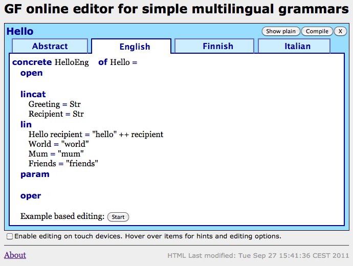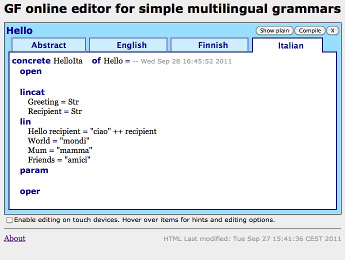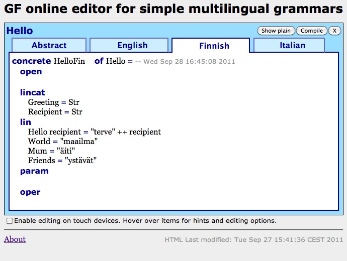 Union - Bulgarian, Danish, Dutch, English, Finnish, French, German, Italian, Polish, Romanian, Spanish, and Swedish - and 3 other languages - Catalan, Norwegian, and Russian. In addition, there is constant on-going work on creating new resource grammars, in particular Arabic, Farsi, Hebrew, Hindi/Urdu, Icelandic, Japanese, Latvian, Maltese, Portuguese, and Swahili. The coverage and accuracy of the GF grammar library resource varies among the different languages and is documented on the web site of GF.