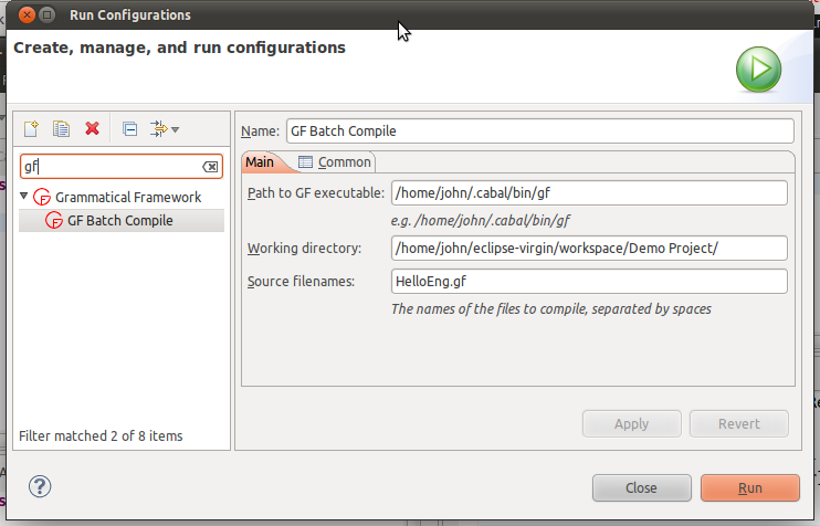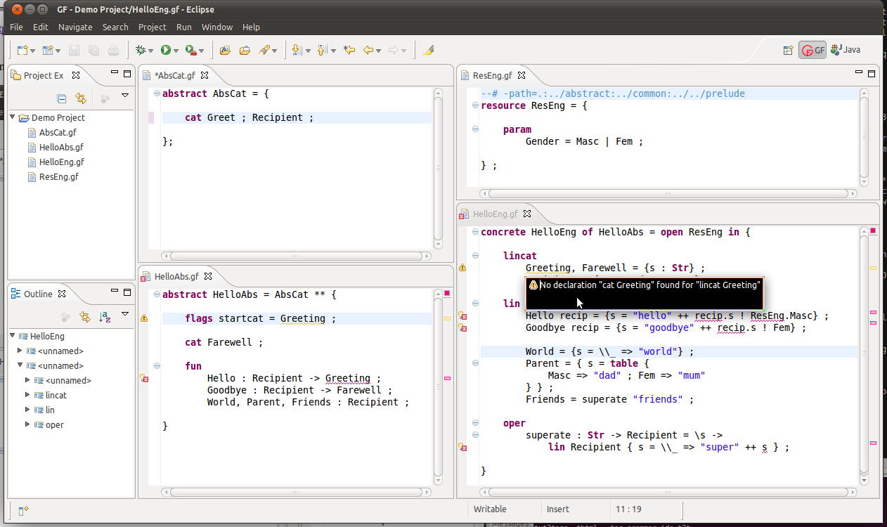 A different, more sophisticated high-level integrated development environment is based on the Eclipse platform and specifically tailors GF grammar-writing. The GF Eclipse plugin (by John Camilleri) currently features real-time syntax checking, automatic code formatting, import-aware auto-complete suggestions, cross-reference resolution, inline contextual documentation, "New Module" wizards, external library browsing, launch shortcuts to the GF shell, and a visual tool for running treebank test suites. These new, powerful, time-saving development tools are aimed at both new users and GF veterans alike. It is available online at http://www.grammaticalframework.org/eclipse/ and at http://www.molto-project.eu/wiki/gf-eclipse-plugin.