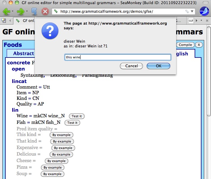 A different kind of controlled natural language is one that is used to command an interactive software system, for instance a computational engine such as Sage. The GFSage software application (by Jordi Saludes) shows a command-line tool able to take commands in natural language, have them executed by Sage, and have the answers rendered in natural language too. The image on the side shows the web interface of Sage augmented by the MOLTO natural language command module. Note that this application demonstrates how a MOLTO library can add multimodality to a system originally developed with keyboard input/output as user interface. In fact, by piping the results to a speech engine, one can have the results aurally thus increasing accessibility of the computational systems to the visually impaired. The natural language interface relies on the Mathematical Grammar Library that can be tested at http://www.grammaticalframework.org/demos/minibar/mathbar.html and documentation on the GFSage module is available as deliverable http://tinyurl.com/78bh4ap from the MOLTO wiki http://www.molto-project.eu/wiki/d62-prototype-comanding-cas.