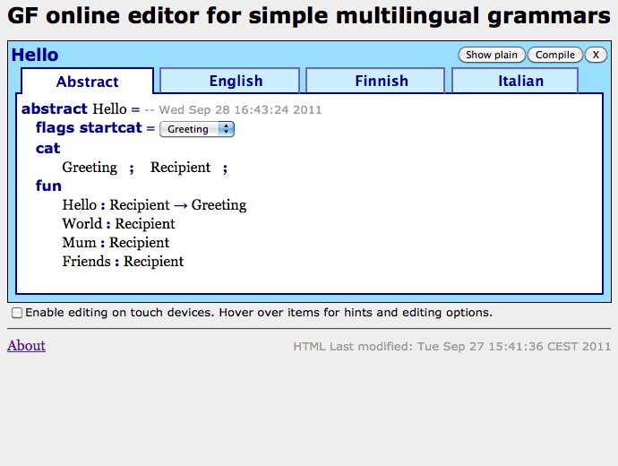 Translation systems in MOLTO rely on multilingual grammars written in the GF programming language. Until now, the development environments available to GF grammarians consisted of a generic text editor, such as Emacs, used in combination with the GF interactive command shell, and the online GF documentation. This is a simple and effective environment for the experienced grammar developer. To better support less experienced grammar developers, one of the goals of the MOLTO project is to create an Integrated Development Environment for grammar development. The GF Simple Editor (by Thomas Hallgren), an initial prototype of a web-based grammar development environment that offers the same core functionality as the traditional environment is now available at http://www.grammaticalframework.org/demos/gfse. Its main features include grammar editing, grammar compilation, error detection, testing and visualization. Moreover, it enables the creation of web-based translation systems without installation of any software, as it is using web services to carry out compilation and interpretation tasks, and thus gives quick access to GF to novice and occasional users. Intended scenario for this editor is in supporting fast testing and prototyping of example grammars in tutorial settings, for instance during teaching and demonstrating GF.
