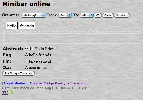 The MOLTO Phrasebook (by Aarne Ranta et al.) is one such controlled natural language, whose domain is that of touristic phrases. It covers greetings and travel phrases such as "this fish is delicious", "how far is the airport from the hotel" in 17 languages. The translations show the kind of quality that can be hoped for when using a GF grammar that can handle disambiguation in conveying gender and politeness, for instance from English to Italian. It is available both on the web from http://www.grammaticalframework.org/demos/phrasebook/ and as a stand-alone, offiline Android application, the PhraseDroid, from http://tinyurl.com/7tyzvfd. Screenshots of the mobile application are shown in the image on the side.