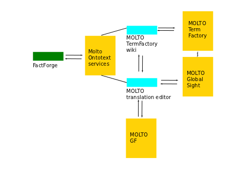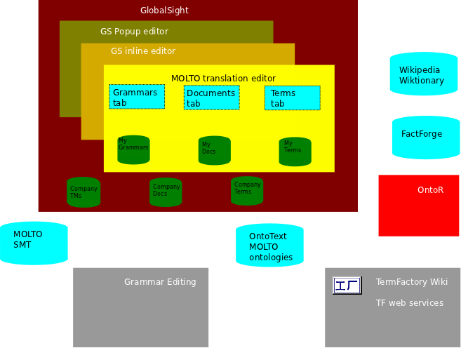 The MOLTO translation environment is being developed (by UHEL with contributions of UGOT) as a customization the GlobalSight translation system (www.globalsight.com). The aim is to be able to embed MOLTO translation tools to a third-party translation platform. MOLTO tools are designed with a focus only on translation. GlobalSight is an open source translation management platform, which provides the infrastructure needed in a professional translation workflow. More specifically, a MOLTO translation editor will be available on the side of conventional editors and be characterized by the possibility of fetching terms from the FactForge ontology via the TermFactory database, allowing to import and export terms in TermFactory. Terminology work is also supported by OntoR, an ontology extraction system (by Seppo Nyrkkö) implemented as s semi-supervised machine learning process, where new term dictionary candidates may be found in given text, by finding "closest matches" in previously known _ontologies_ (i.e. hierarchical vocabulary, term structure, usually industry or domain specific). A corpus-harvested new term can be _aligned_ with its closest matches in an prior existing term ontology. New term's functional and semantic environment is analyzed, and the feature variables extracted are compared to values of previously known terms. The user is given the supervision control to decide the best alignment match and thus refine the ontology incrementally. These tools are not yet ready for distribution but a preview can be seen during the project meetings' open days.